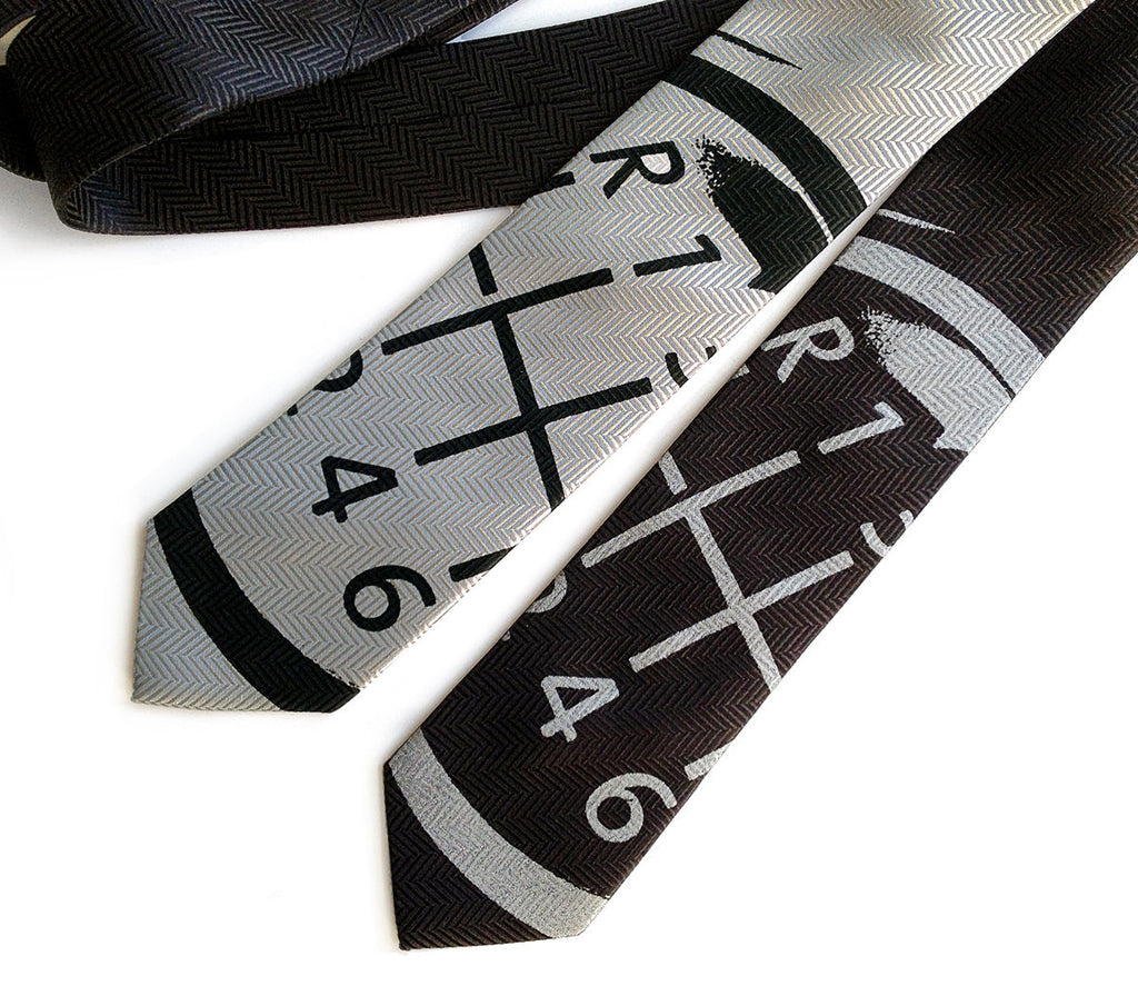 Gear Shift herringbone silk necktie. 6-Speed stick shift - Car lovers know manual is not only more fuel efficient, but *way* more fun to drive! Original illustration from our photo of a Volkswagen GTI shift knob. We have new colors AND a new fabric for you!