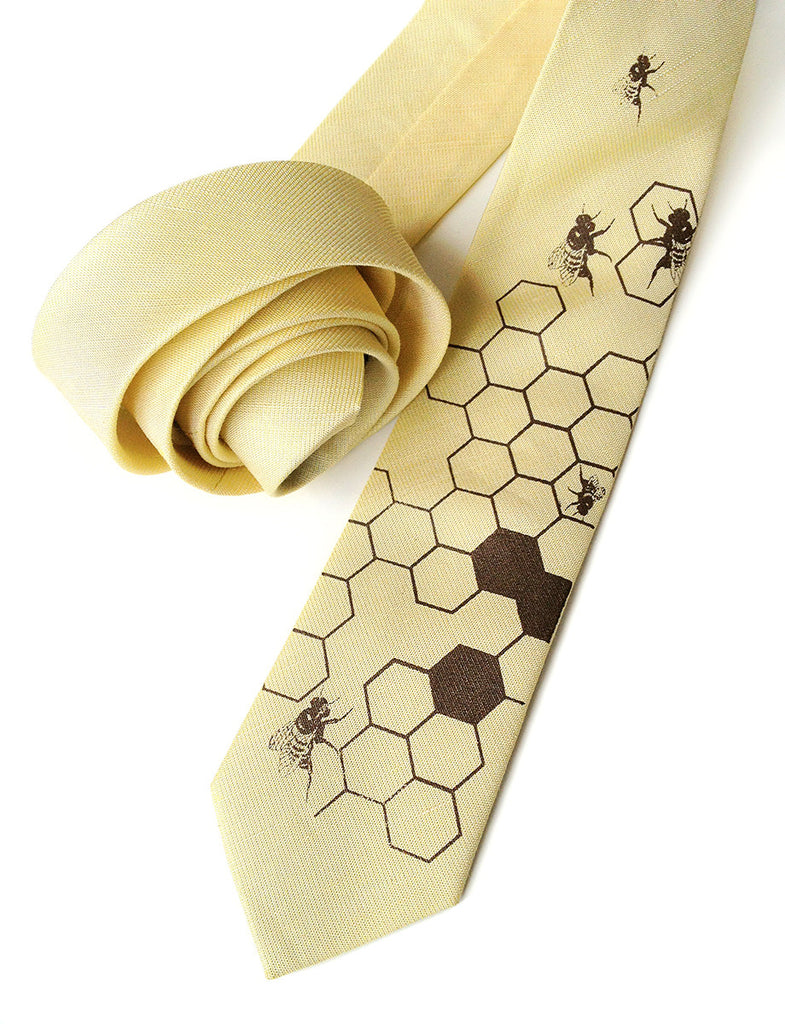 Honey Bee Linen Necktie. Bee Hive "Oh Honey" tie. Honey bees & hive design. Got a Queen Bee in your life? They deserve a Bee Hive tie, its the bee's knees! Shown first: Chocolate on Paczki (butter yellow).