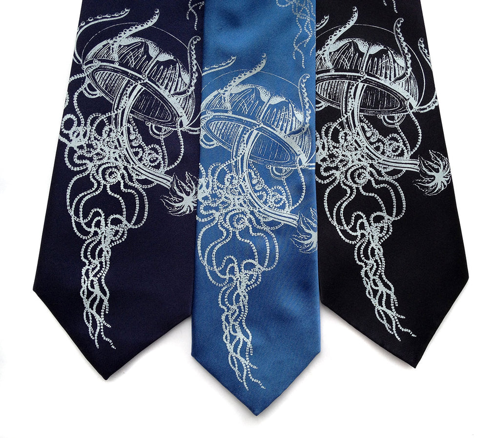 Jellyfish silk necktie. Trachomedusae. Adapted from the drawings of Ernst Haeckel, this design spans 16" high up the length of the tie, so a tentacle for jellyfishy noggin will peek out even when wearing a jacket or vest!