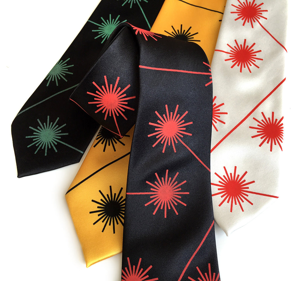 Laser Radiation Warning Necktie. Don't Stare into beam! You'll put your eye out! We made a pattern from the classic "Class II or Higher" laser safety warning label. Rock this whether you love entertaining cats with laser pointers, have a laser cutter at your maker space, or innovate anything that goes pew pew pew!