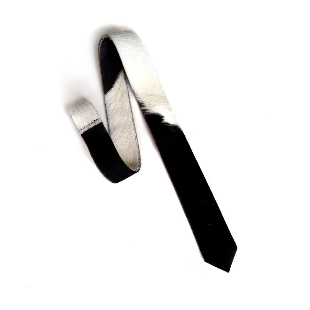 Natural Black and White Holstein Hair-On Hide Leather Necktie. Hugh Heifer? With a nod to Méret Oppenheim’s surrealist fur cup and saucer, this statement piece can go ranch to red carpet in an instant. Luxurious hair-on pony fur cowhide with a soft suede reverse: weighty, rugged, fashionable. Laser cut in-house for perfect crisp, modern lines. We've carefully selected hides for both fashion and durability - leather ties are meant to not only span the seasons, but decades. Each is one of a kind, no two leathers are ever exactly alike.