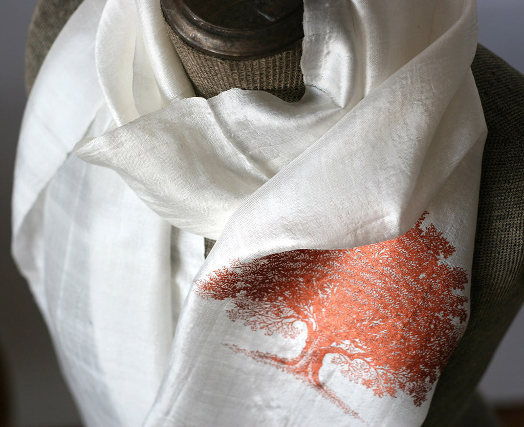 A regal oak tree on one end of a fair trade silk scarf is a stylish way to wear this symbol of strength and longevity.