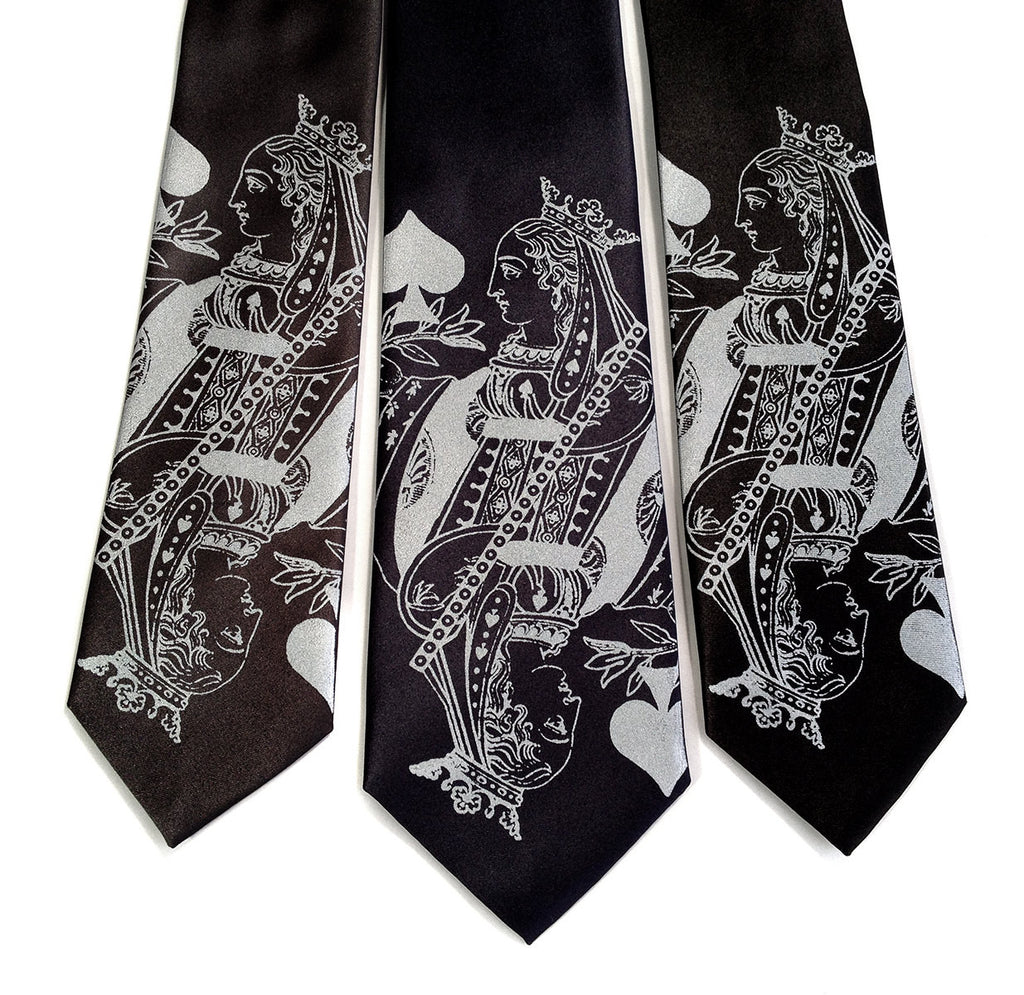 Queen of Spades playing card silk necktie. Got a card shark in need of the perfect gift? Magician or card trickster? Need help with your game? Improve your poker face with our face card neckties. Good luck for high-rolling luxe casino gamblers and basement man cave players alike. Original illustration adapted from a late 19th century French deck of playing cards.