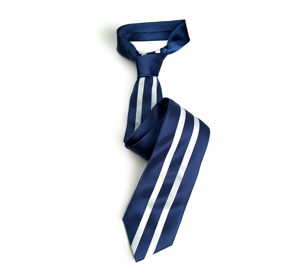 Blue and white racing stripes silk necktie: "Side Oiler," white on a french blue tie, inspired by the iconic Cobra 427.