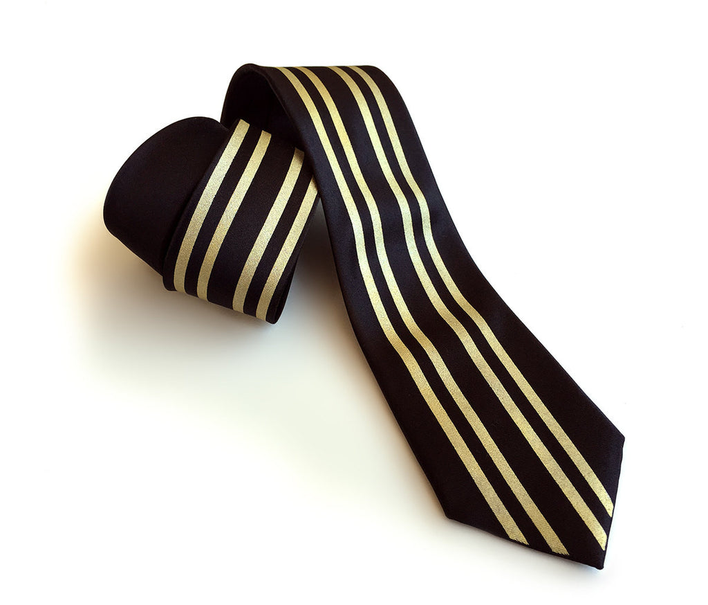 With some ways of tying, the knot will remain solid black and the stripes will fall at or just under the knot. The stripe is printed to the bottom point and 23 inches up the tie. The wearer can experiment with different kinds of knots and tying lengths to have some or all of the gold stripes appear in the knot. Stripe positioning will depend on the wearer's height and neck size.