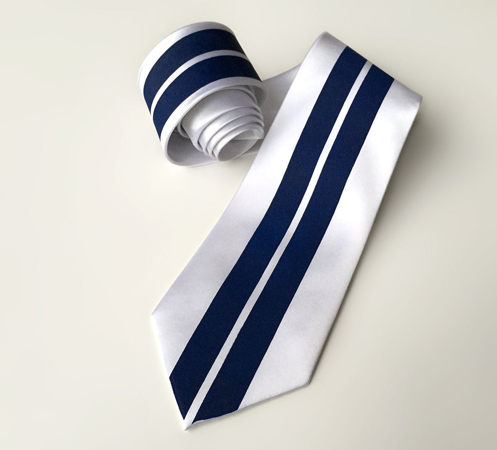 White & blue racing stripes necktie -- years ago before sponsorship logos ruled the look of race cars, the vehicle's color was associated with the homeland of the car's owner. Country colors were agreed upon in the early days of auto racing and standardized in the FIA's code. While the FIA no longer requires that race cars follow this color code, there's still much nostalgia surrounding these vintage paint schemes. White with blue stripes was considered to be the American road racing colors in international competition. This classic theme is a tribute to the Briggs Cunningham road race cars of the 1950s and the true origin of the racing stripe.