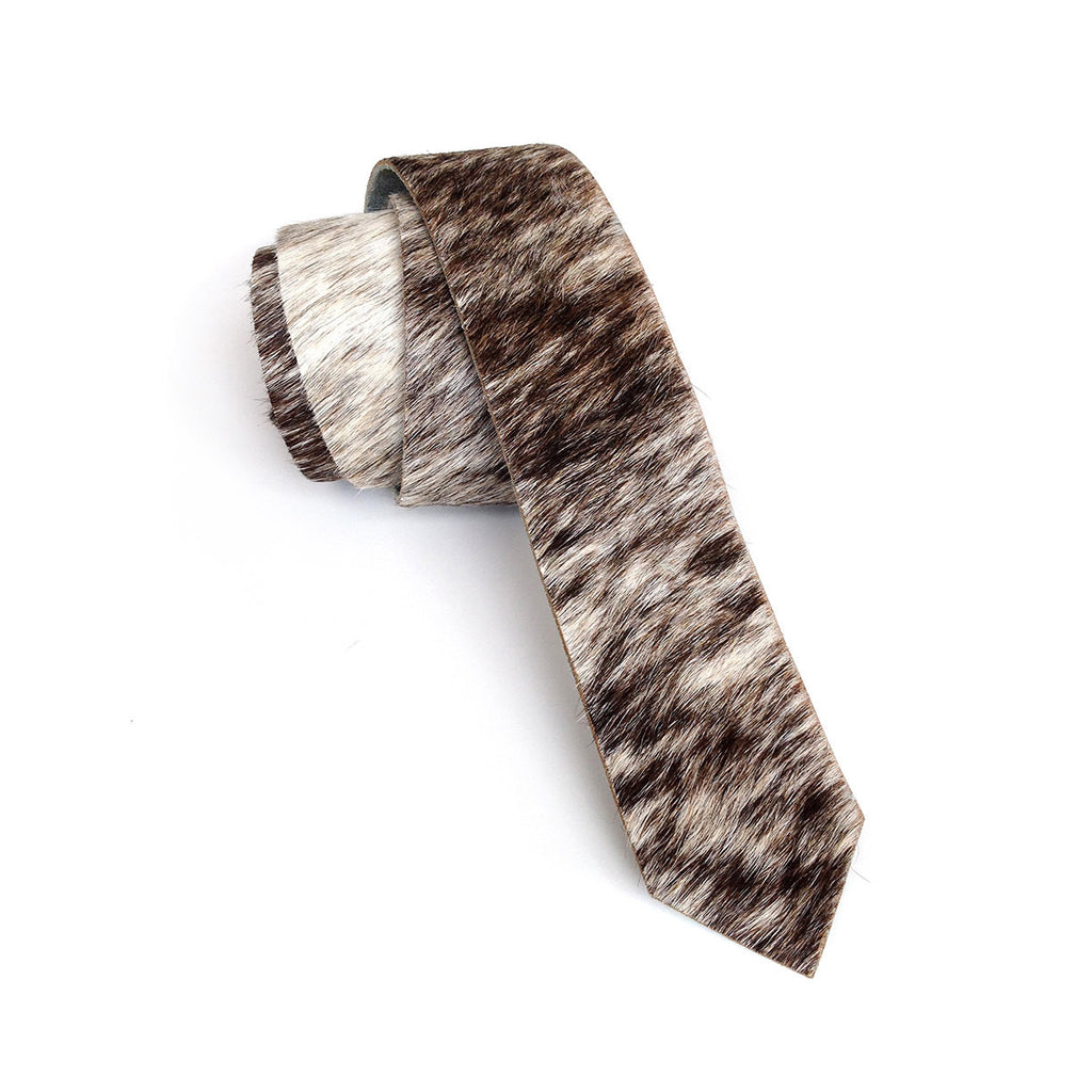 Salt and Pepper Brindle Hair-On Hide Leather Necktie. Hugh Heifer? With a nod to Méret Oppenheim’s surrealist fur cup and saucer, this statement piece can go ranch to red carpet in an instant. Luxurious hair-on pony fur cowhide with a soft suede reverse: weighty, rugged, fashionable. Laser cut in-house for perfect crisp, modern lines. We've carefully selected hides for both fashion and durability - leather ties are meant to not only span the seasons, but decades. Each is one of a kind, no two leathers are ever exactly alike.