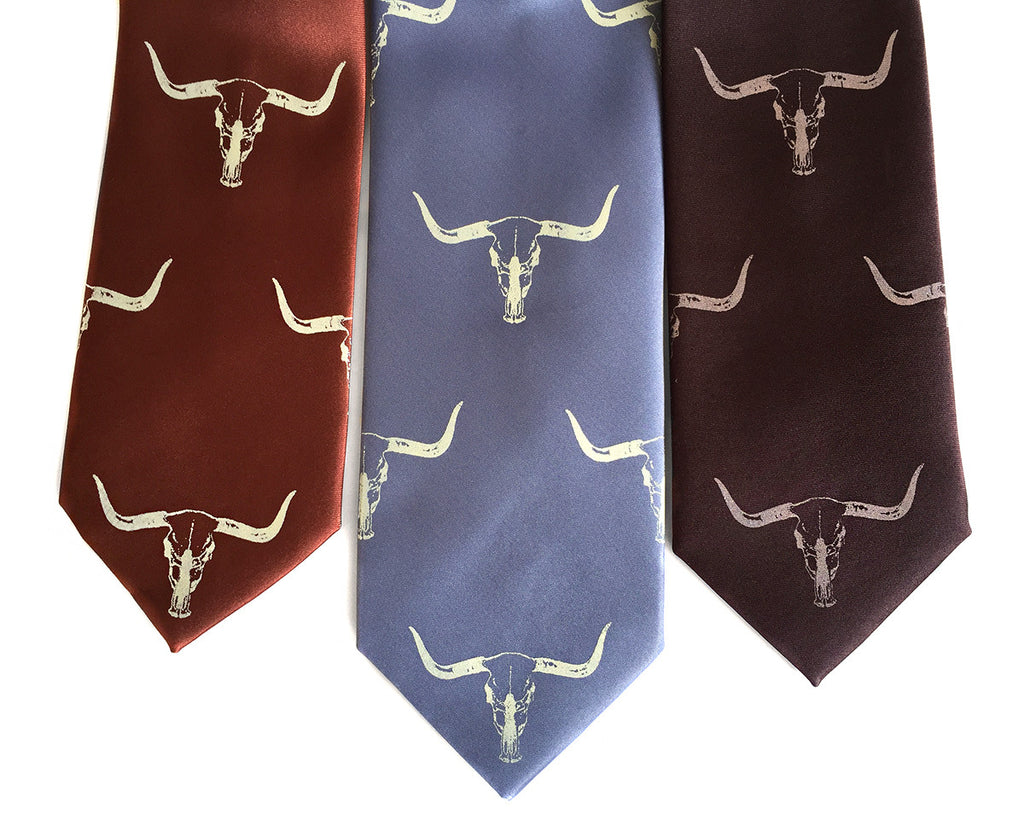 Longhorn Steer Skull necktie. You can take the day by the horns! Take absolutely no bull* because this tie will undoubtedly make your day's meetings awesome whether they take place in the office or on the ranch. Choose from earth tones, southwestern hues or classic black.
