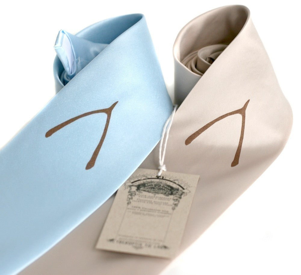 A little wishbone is printed high upon the necktie so that it'll peek through a jacket or vest. Shown: sillver on burgundy and bronze ink on sky blue and champagne. Original illustration.