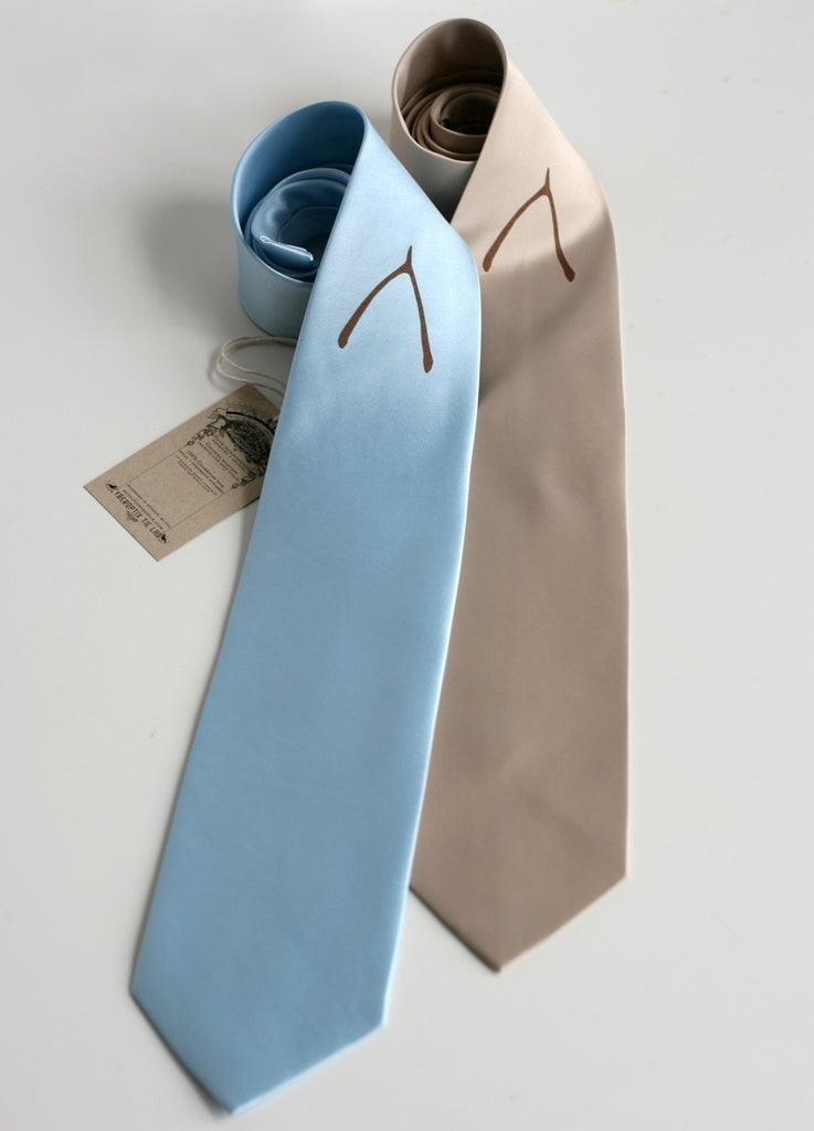 A little wishbone is printed high upon the necktie so that it'll peek through a jacket or vest. Shown: sillver on burgundy and bronze ink on sky blue and champagne. Original illustration.
