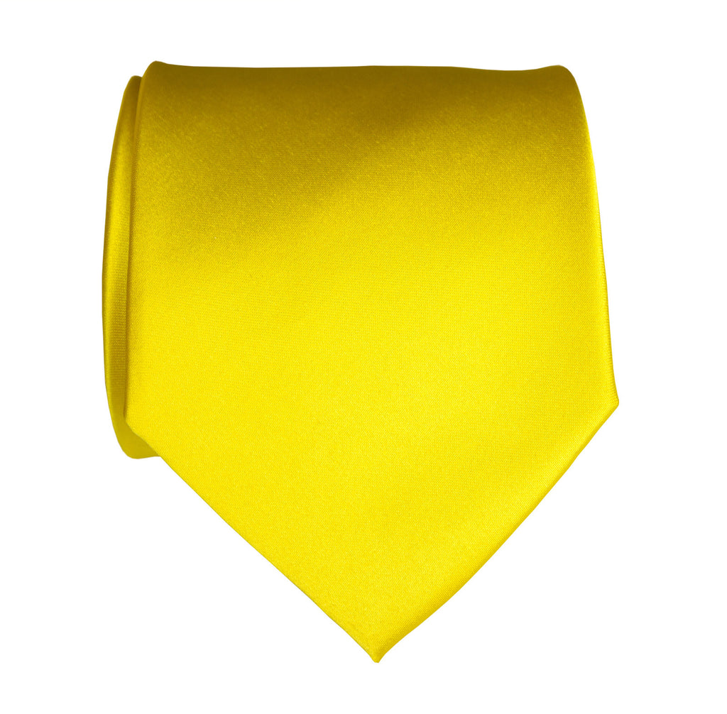 Lemon Yellow Necktie: Solid Color Satin Finish Tie, No Print. Perfect for any formal occasion, or for when you need a plain, bright yellow necktie in your wardrobe. How can this possibly be hard to find? (Well it is.) But fear not, because we have it! Ties are bias cut, hand rolled, and hand sewn with a hidden slip stitch, ensuring a perfect knot every time.