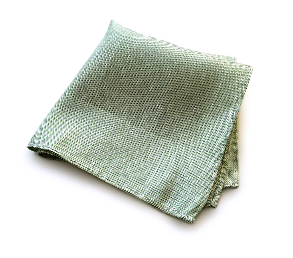 Mint Green linen pocket square. "Spirit" of Detroit handkerchief in our pale seafoam green silk & linen blend. The alternating silk and linen threads in the warp and weft of the fabric are each light and dark, echoing a beautiful patina bronze. When seen together they make an extraordinary solid fabric that shifts in the light up close and at a distance.