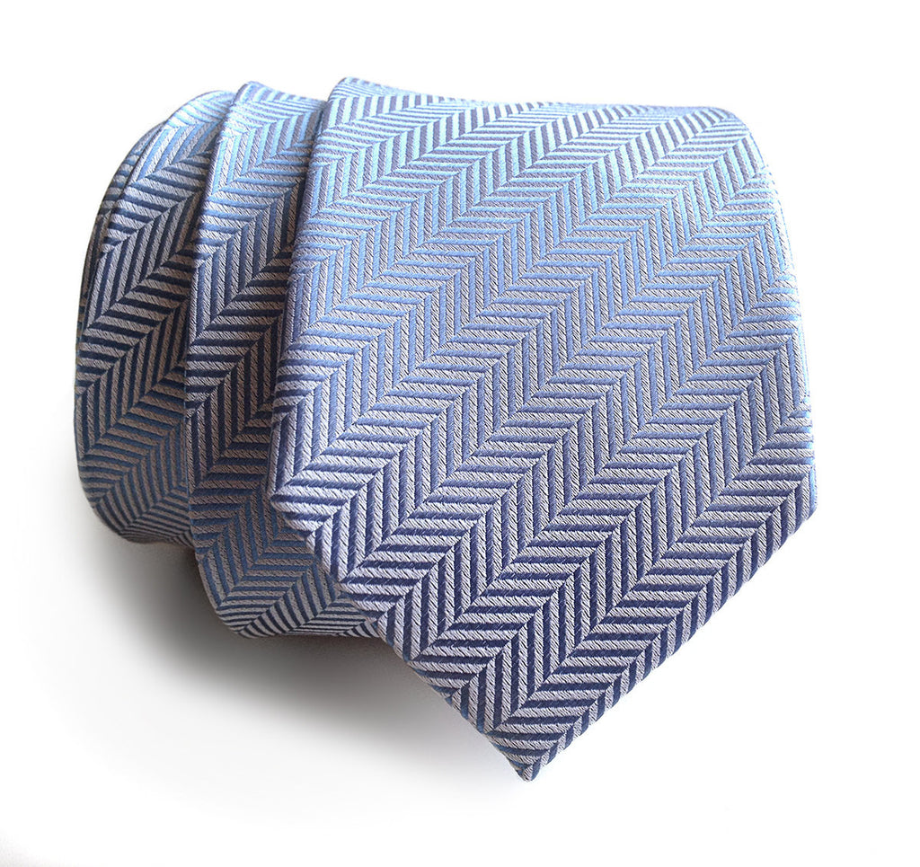 Powder blue solid silk necktie - woven herringbone silk. These come in one perfect "Goldilocks" middle tie size: our narrow, modern slim cut. Not too skinny, not too wide. Just right!
