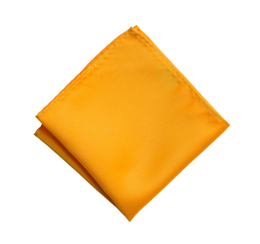 Saffron Pocket Square: Medium Yellow solid color satin finish men's pocket square with no print. Perfect for any formal occasion! How can a medium yellow pocket square possibly be hard to find? Well, those elusive hankies sure can be. Fear not, your search is over, we have everything here just for you! Plus, our prices are kind to you and your pocket.