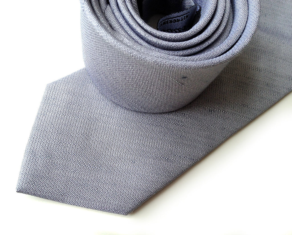 Light Gray Linen Necktie. Silver Solid Color Tie, "Woodward." Our gorgeous silk & linen blend necktie. These come in one perfect "Goldilocks" middle tie size: our narrow, modern slim cut. Not too skinny, not too wide. Just right! The alternating silk and linen threads in the warp and weft of the fabric are each very light and very dark, when seen together make an extraordinarily unique solid fabric when seen at a distance.