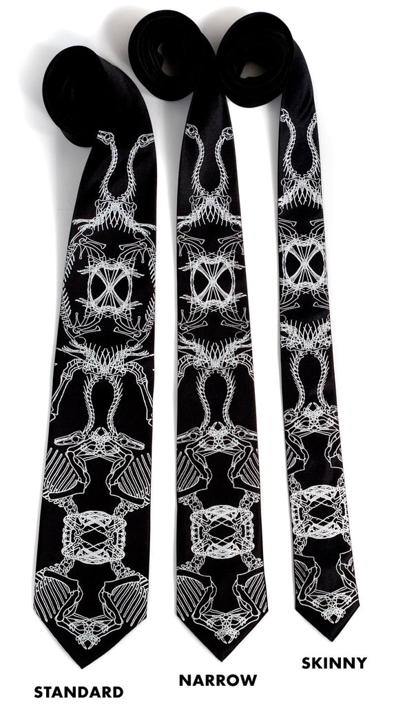 Interlocking dinosaur skeleton necktie. Have we any paleontologists in the house? Impress the hautest of fashionistas and natural history buffs at the same time. Three interlocking dinosaur skeletons are shown: scelidosaurus, iguanodon bernissartensis and compsognathus longipes!