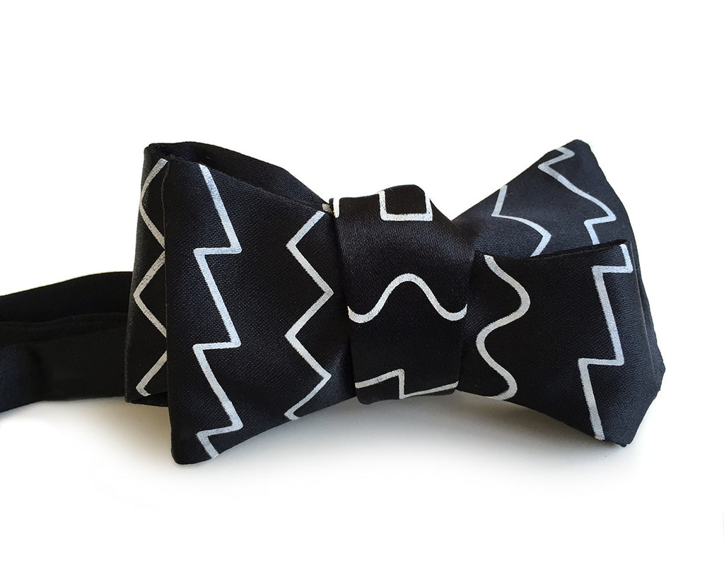 Oscillator waves bow tie. Square, saw, triangle & sine wave stripe print men's tie. Did you think we'd just make a plain ol' geometric striped bowtie? Of course not! This is for all you electronic music lovers and tinkerers of all things that go bleep and bloop. Our stripes range from the smooth sound of a sine wave, to the harmonically rich buzz of a sawtooth wave. Original Illustration.