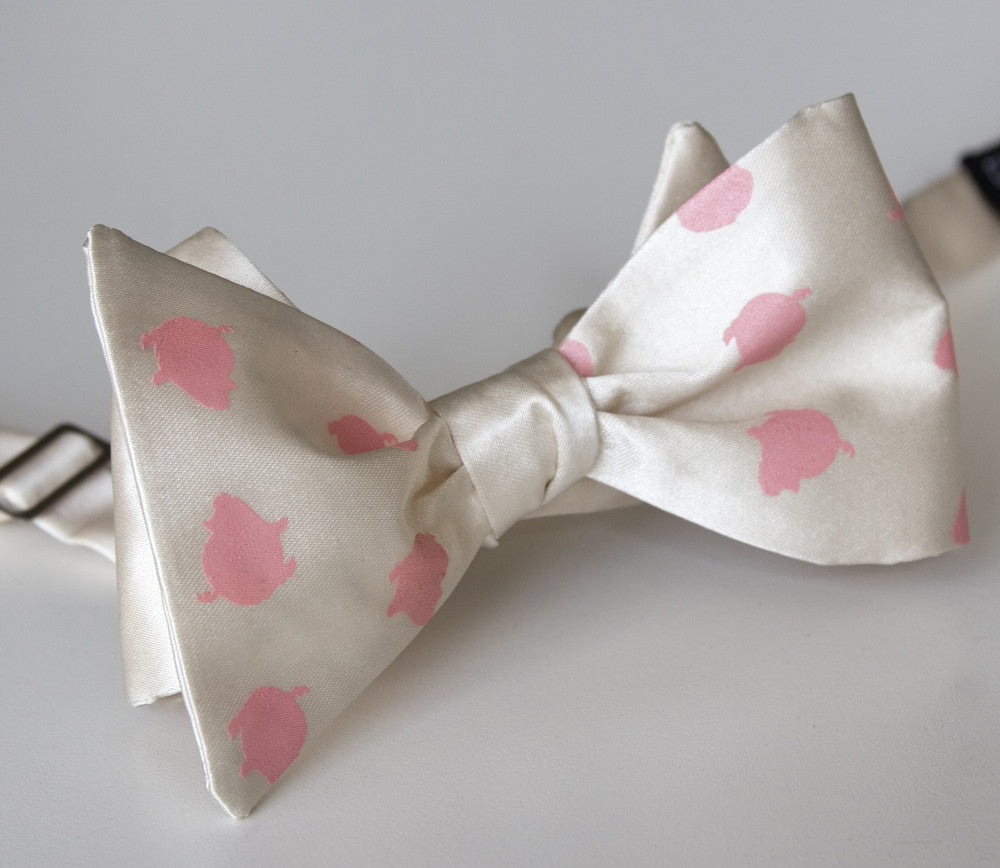 Piggy Pattern Bow Tie. "Porkadot." Cute, round and with a pink, porky belly full of love, these tumbling polka pigs will make you the envy of all your friends, even vegetarians. Finally, a spot of pork that won't ruin your tie!
