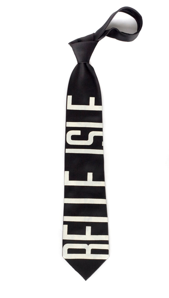 Belle Isle Detroit Necktie, from our series of Detroit neighborhood and landmark-specific neckties. Our beloved Belle Isle is the largest island city park in the United States. From afar, you can see a bold geometric print - but at closer look "Belle Isle" is revealed.