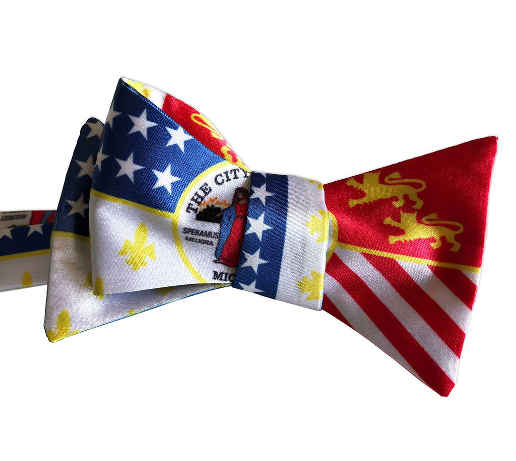 Detroit City Flag Bow Tie, Modern Revision. Now you can be the most dapper Detroit history buff in town with an amazing pop of collar color. When tied, it appears just like the Detroit City Flag flies! Show your enthusiasm for Detroit's resurgence: Our full color city flag features two Latin mottos, "Speramus Meliora and Resurget Cineribus," which translate to "We hope for better things" and "It will rise from the ashes," referencing the 1805 fire that destroyed the entire city. This modern revision of the flag was introduced in 2000 and is what is officially displayed today.