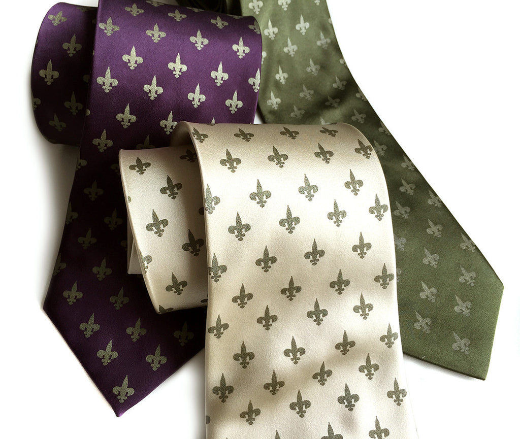 Fleur-de-lis Print Silk Necktie. The English translation of "fleur-de-lis" is "flower of the lily." This symbol, depicting a stylized lily or lotus flower represents French royalty, signifying perfection, light, and life. In the US, the fleur-de-lis symbol aligns with cities near the Mississippi and Missouri rivers, and is represented on flags and seals of the cities of Detroit, St. Louis, Louisville, Mobile, New Orleans, Baton Rouge and Lafayette.