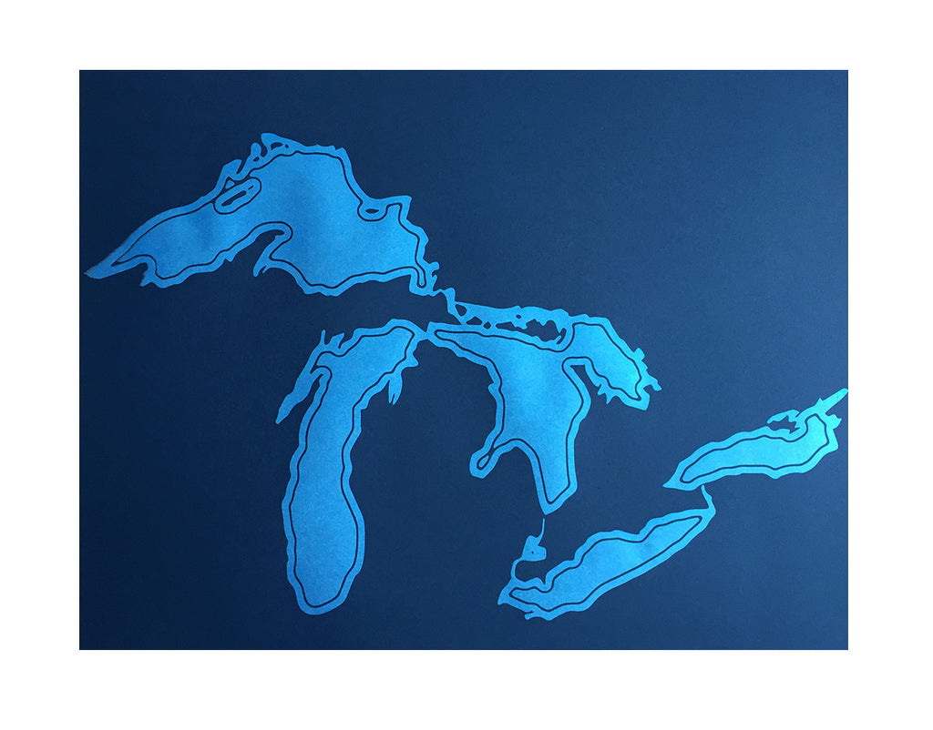 Great Lakes Poster Print. Lakes Michigan, Huron, Erie, Superior, and Ontario. 19 x 25 inches, hand-pulled silkscreen print. Designed and printed by hand in our Detroit, Michigan studio. Shown: Electric blue on navy.