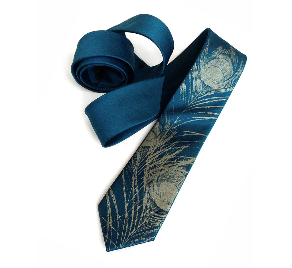 Peacock Feather Necktie. One of our most-loved and customized designs, perfect for fancy nights out and wedding party gifts. Native to India and Sri Lanka, the elegant and exotic peafowl have been the muse of human adornment for thousands of years, from our early history, to art deco, to modern craft.