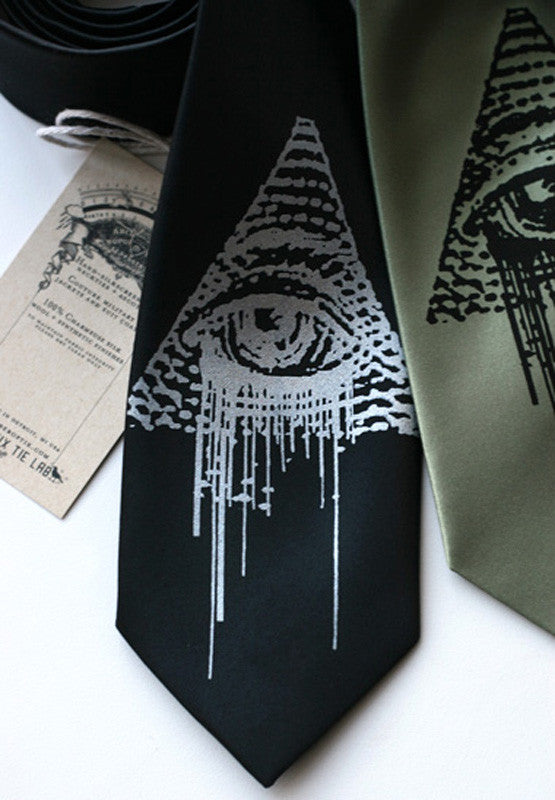 All Seeing Eye men's necktie. Based on a tiny detail from the US One Dollar Bill, and much discussed by conspiracy theorists, the "All-Seeing Eye" or "Eye of Providence" adorns the front of this tie.