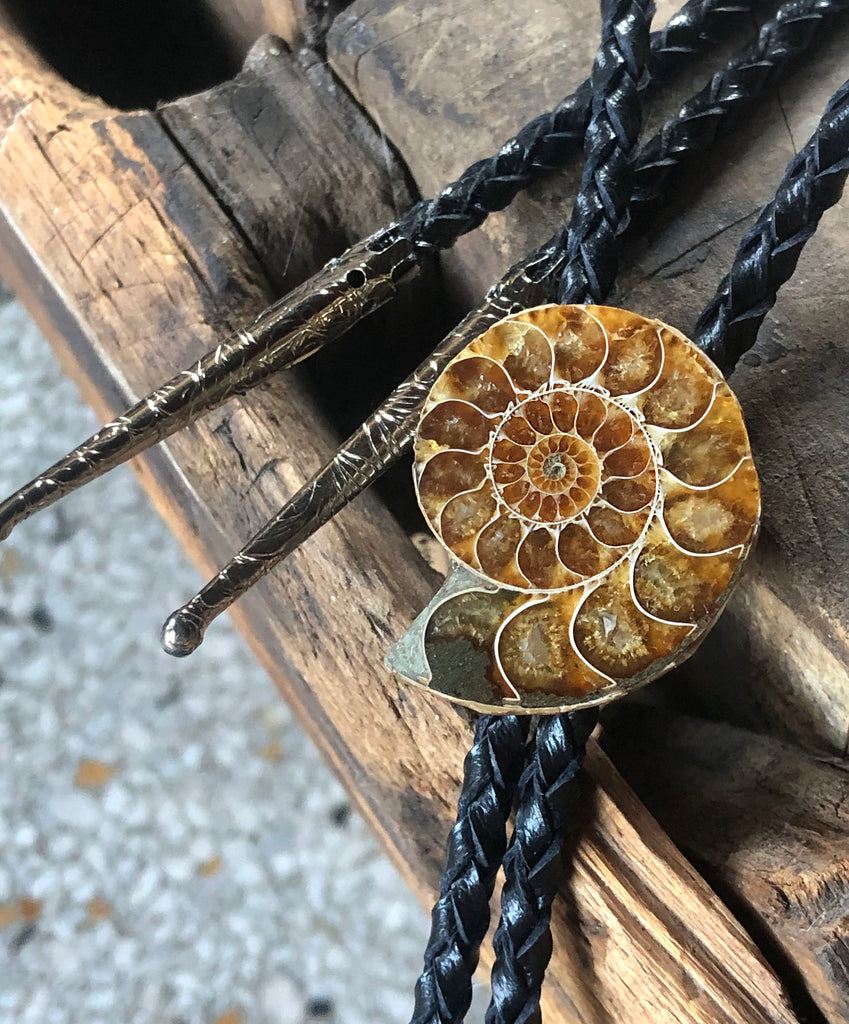 Ammonite Bolo Tie, golden ratio fossil stone western tie