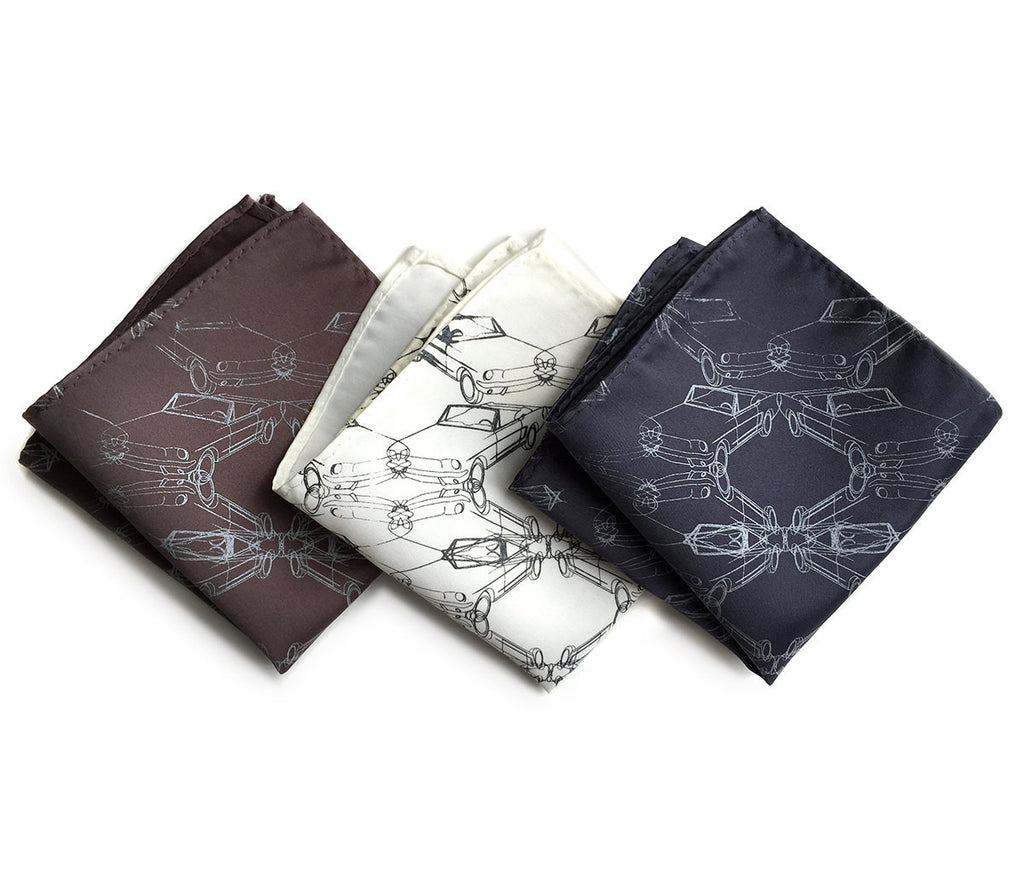Mustang Argyle pocket square. We think may be just about the most elegant way to show your love for classic cars. Hand-drawn by us, then reflected and flipped - these technical drawings become a subtle argyle pattern perfect for automotive aficionados for even the most formal events! This version (1964) is inspired by the first-generation Ford Mustang convertibles. Original illustration.