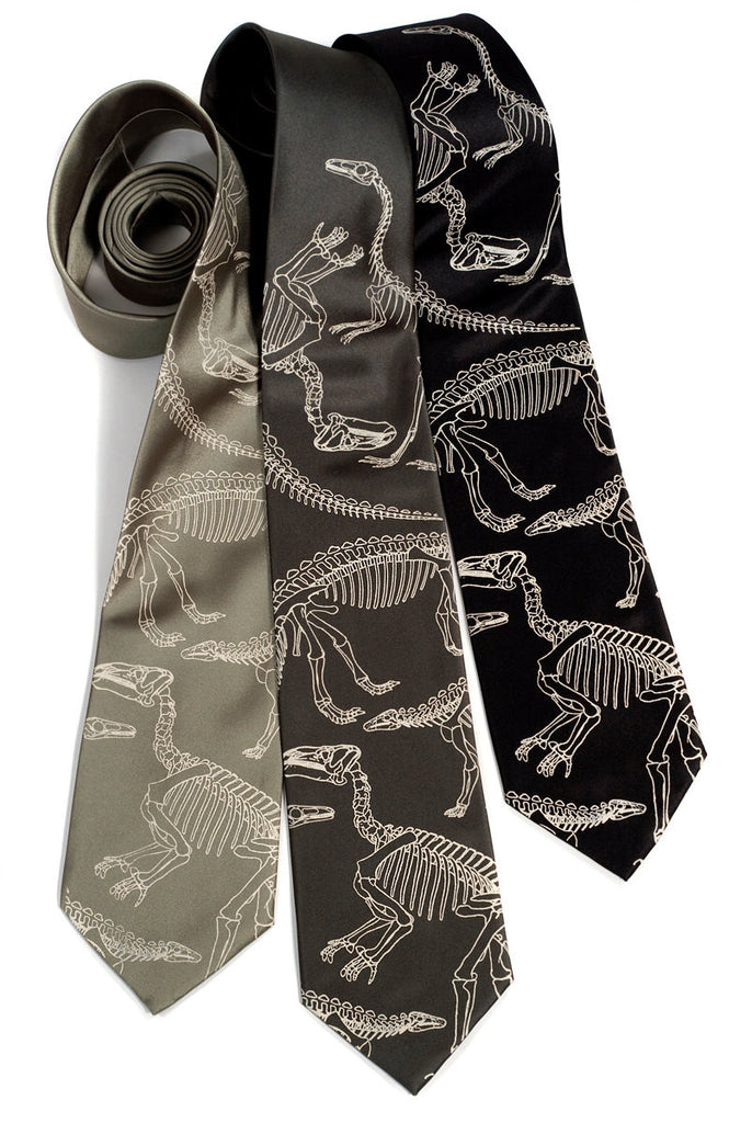 Dinosaur Bones necktie, fossilized dinosaur skeleton tie. Have we any paleontologists in the house? Dig in! Now you can impress the fashionable set and natural history buffs at the same time. You've found the perfect gift for the paleontologist, science teacher, geology major or anyone who loves and appreciates natural history, and looking good while getting dirty.