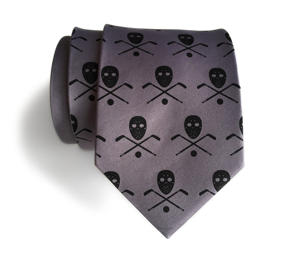 Hockey necktie. Hockey stick, puck & goalie mask print. No tacky novelty sports ties here - now you can arrive at the rink in style!