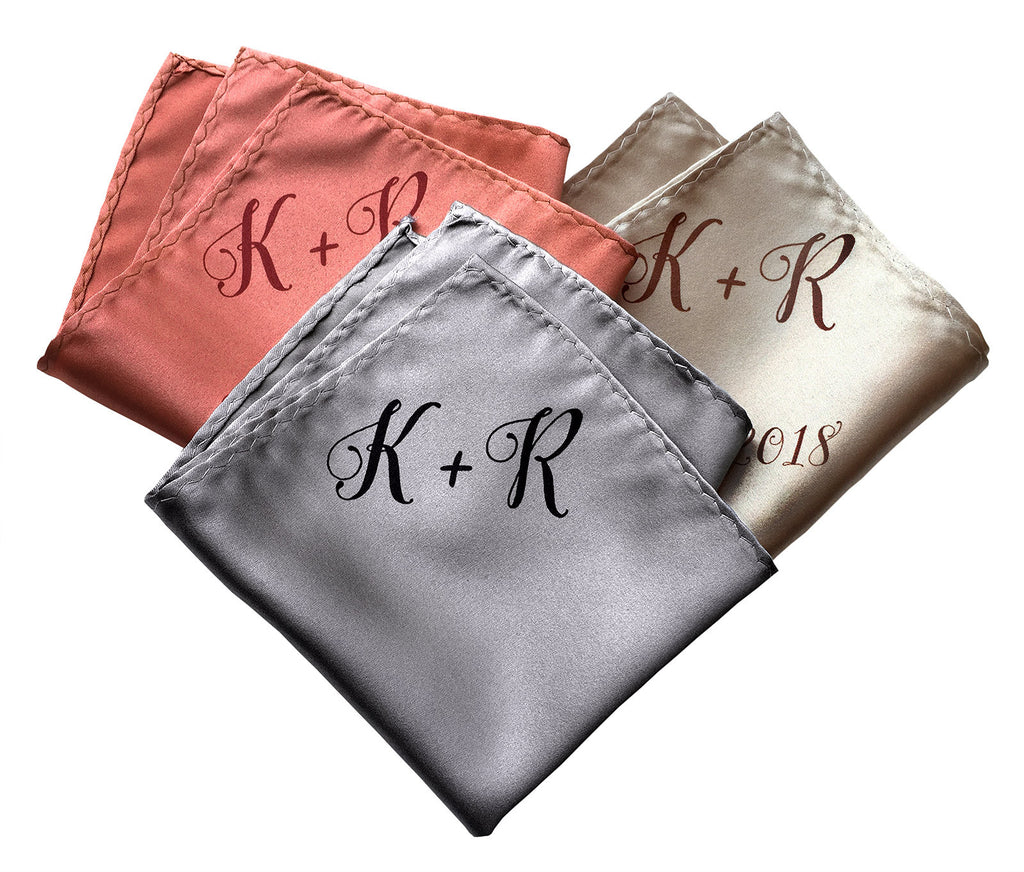 Custom Wedding Pocket Squares. Personalized Initial or Name. Ever scrawl your love initials on tree? Now you can have it on a pocket square. We'll do it right in house for you! A perfect keepsake for groomsmen, wedding parties and keeping it personal. Finally we're offering a custom monogram/initial pocket square in a beautiful handwritten script font, just for you, your big day, or that special guy that needs his name (our yours) in his pocket.