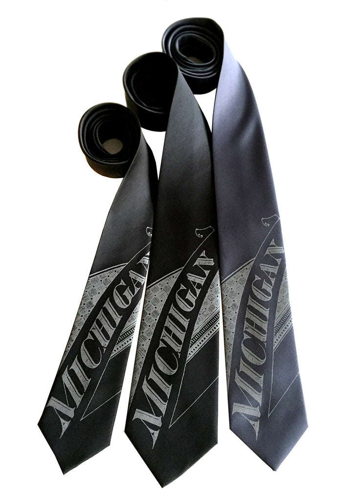 Michigan Necktie. "Michigan" is printed in our Roaring Twenties historic script. Painstakingly re-drawn from a graphic fragment found in an illustrated 1920's Detroit Map.