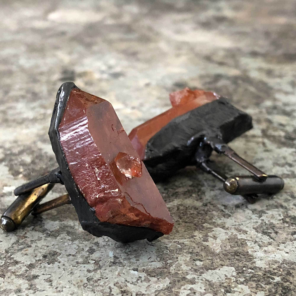 Red Quartz Cufflinks, electroformed copper & hematoid quartz points. Deep red crystal points, raw stone men's cuff links. All handmade; we love metalworking, copper electroformed by us right in-house!